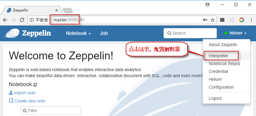5.1 首先启动浏览器,在浏览器地址栏输入:http://192.168.190.128:9090/,打开访问界面,如下图。点击右上角的小三角按钮,打开下拉菜单,点击"Interpreter"菜单项,打开解释器配置界面。