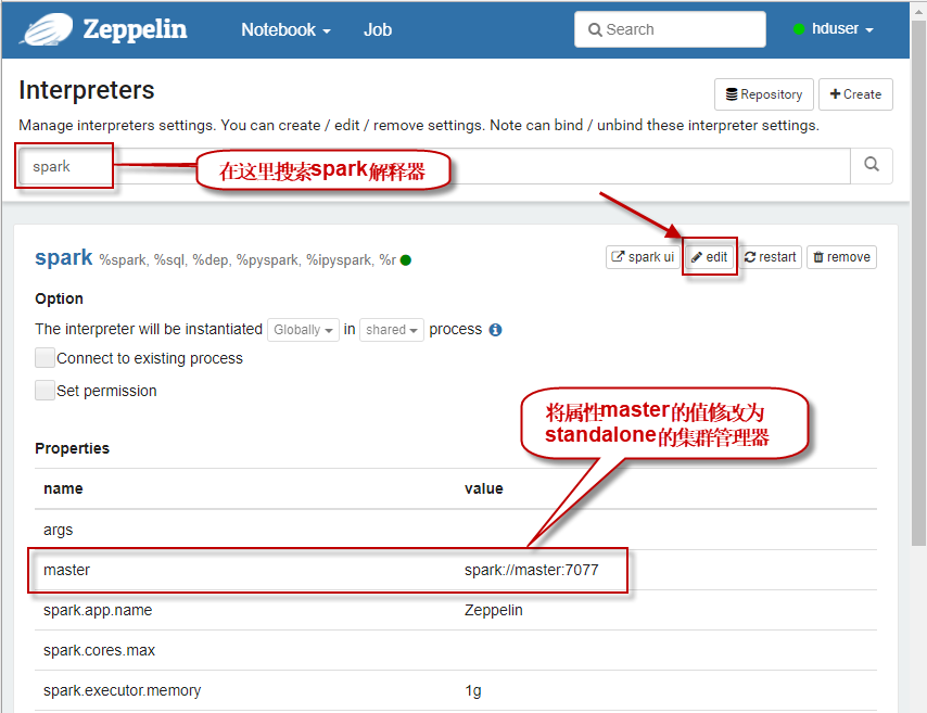 5.2 打开的解释器配置界面如下图所示。按图中所示找到spark解释器,然后修改master属性值为spark://master:7077(这实际上是连接到的集群管理器,我们这里使用的是spark standalone模式。这相当于启动Spark Shell时指定--master参数),然后单击【Save】按钮保存。其它参数酌情设置。