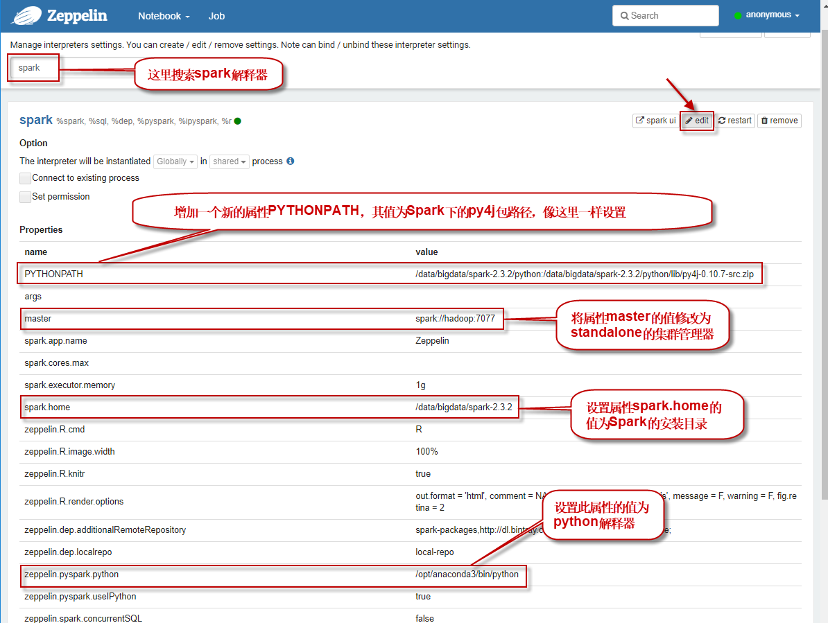 说明:如果是使用Spark local模式,此一步骤省略。如果是使用Spark standalone模式,需要配置Spark解释器。