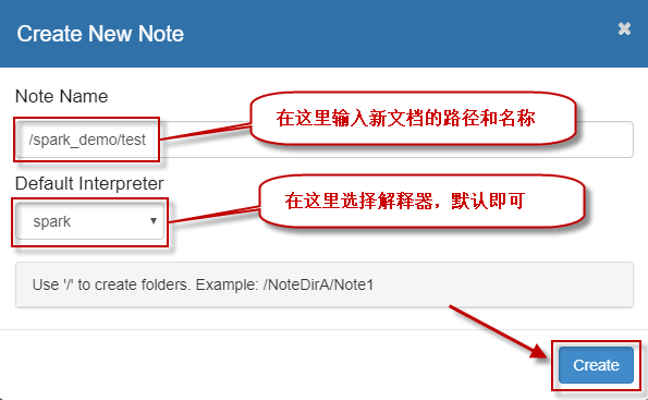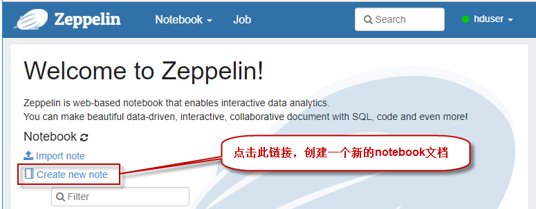 6.1 回到浏览器zeppelin首页,点击按钮,创建一个新的notebook文件,如下图所示: