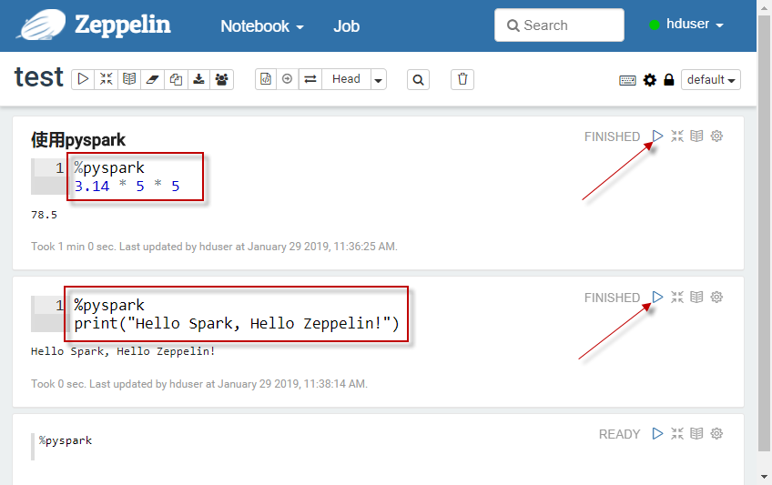 8.2 在新打开的notebook界面,执行Python代码。需要在第一行键入%pyspark,以告诉zeppelin使用pyspark解释器。如下图所示: