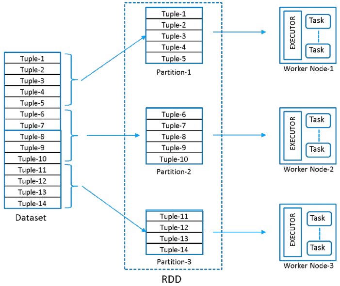 下图表示创建一个RDD,包含14条记录(或元组),分区为3,分布在三个节点上: