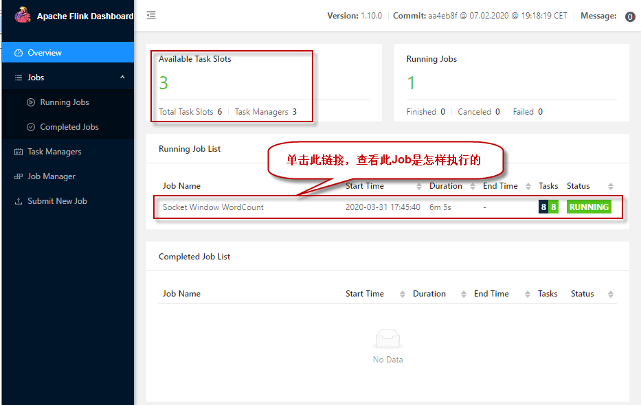 打开浏览器,输入地址:http://master:8081 ,可查看检查调度程序的web前端。web前端应该报告有三个可用的TaskManager实例,以及正在执行的作业。Flink WebUI包含许多关于Flink集群及其作业(JobGraph、指标、检查点统计、TaskManager状态等)的有用而有趣的信息。
