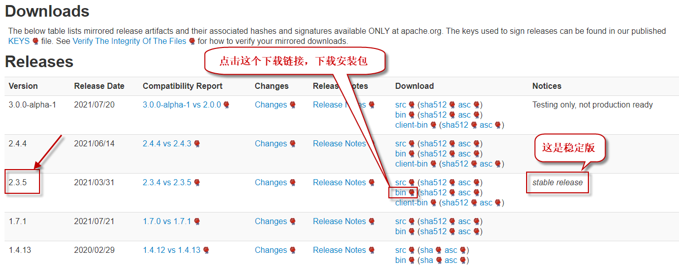 注意,选择合适的版本。这里我们选择长期稳定版2.3.5(您下载时也许版本有所变化),如下图所示: