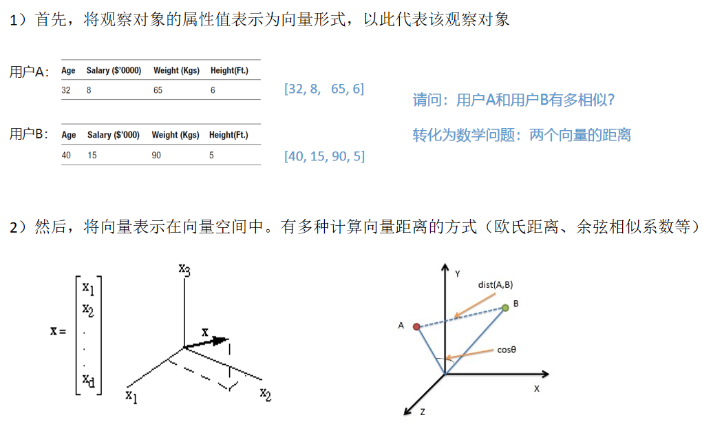 在本任务需求中,实际上是要求实现按商品相似度进行商品推荐,即推荐与任务一中找出的10位用户(他们与用户1605所购买相同商品种类最多)所购买的商品最相似的5种商品。物品相似度计算原理如下图所示: