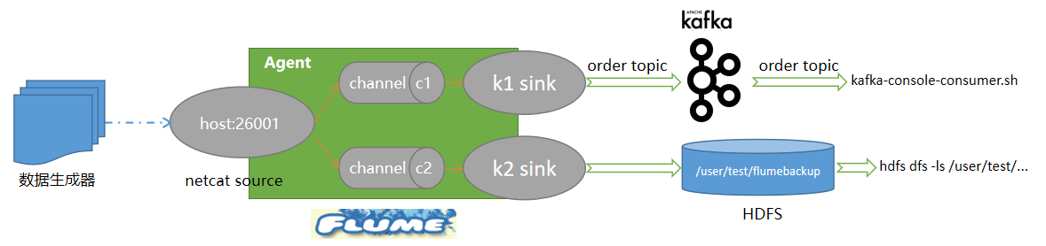 2. 采用多路复用模式,Flume接收数据注入kafka 的同时,将数据备份到HDFS目录/user/test/flumebackup下,将查看备份目录下的第一个文件的前2条数据的命令与结果截图粘贴至客户端桌面【Release\任务D提交结果.docx】中对应的任务序号下。