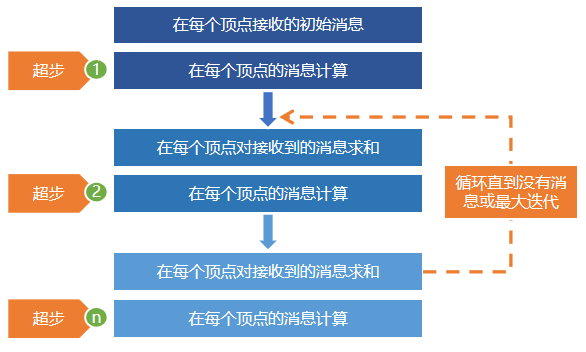 消息通过边triplet的一个函数被并行计算,消息的计算既会访问源顶点特征也会访问目的顶点特征。在超步中,没有收到消息的顶点会被跳过。当没有消息遗留时,Pregel操作将结束迭代并返回最终的图。