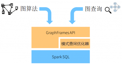 GraphFrame集成了图算法和图查询,支持跨图和Spark SQL查询的优化,而不需要将数据移动到专门的图数据库。如下图所示。