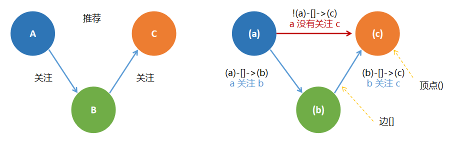 例如,可以搜索这样的模式:A关注了 B,B 关注了 C,但是A并不关注C。找到这样的结果后,就可以把C推荐给A。如下图所示。